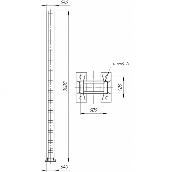 МГП1-10-100 — металлическая стойка опоры контактной сети ж/д из гнутого швеллера, цельная (один пояс), высотой 10 метров, изготовленная из низколегированной марки стали С245.