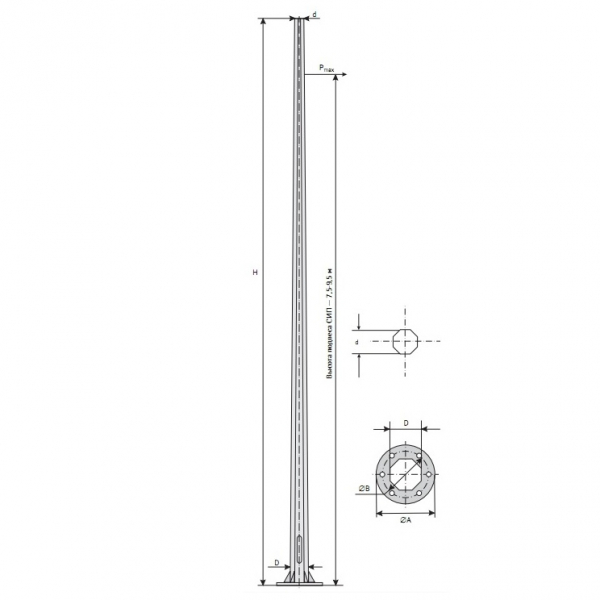 | Марка опоры | Нагрузка, кг | Высота опоры Н, м | Размер верха d, мм | Размер фланца А, мм | Межцентровое расстояние В, мм | Диаметр болта do, мм | Кол-во отверстий | Отпускная цена за шт, руб. с НДС |